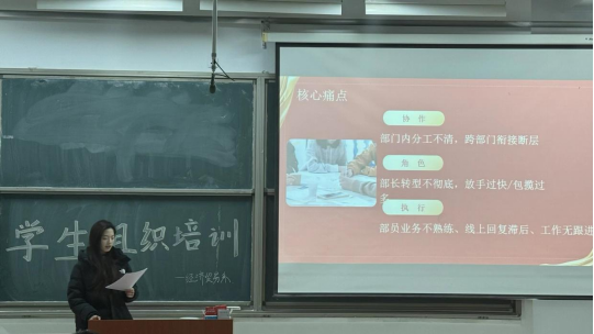 接着,王小星同学围绕“聚力经贸,赋能成长”的主题,精准剖析了当前学生组织工作中存在的高频问题。她直击痛点,针对部门分工不清、部员工作不熟练等一系列问题,提出了系统化的解决方案和高效工作方法。最后,她发出具体行动倡议,期待各组织能够结合本次培训的内容制定提升计划,共同打造更加高效、团结的学生工作团队。