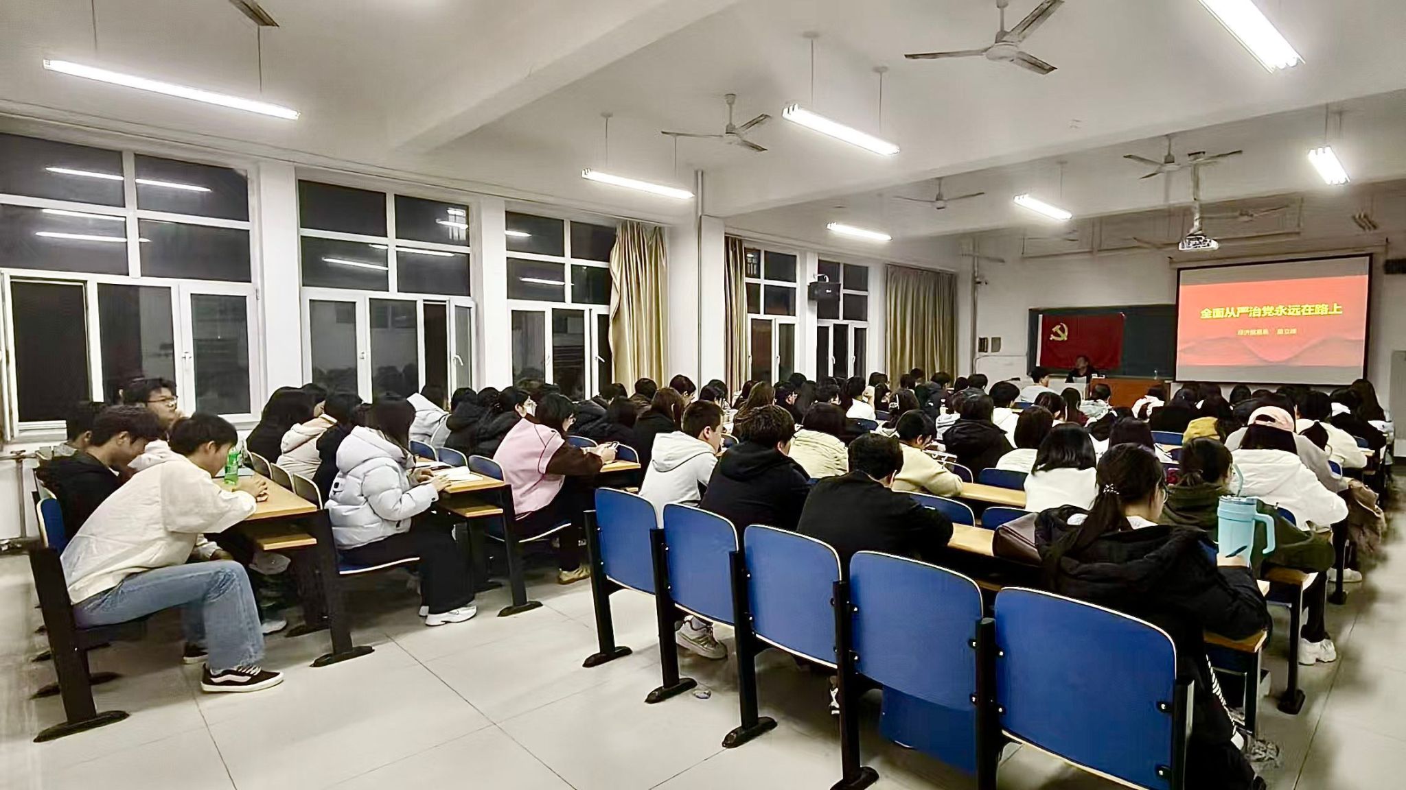 首先,苗立峰书记以深刻认识全面从严治党的重大意义为切入点,详细讲述了中国共产党从严治党道路的历史发展,以案例的形式强调了政治腐败和丧失民心的严重后果,使同学们深刻认识到了从严治党的重要性。随后,苗立峰书记从国内和国际两个视角进行了阐述。在国内,苗书记讲到党的十八大以来,积极开展反腐斗争,最终取得了反腐斗争的胜利,整治了党内政治环境。国际方面,苗立峰书记客观阐述了社会主义仍处于初级阶段的现状,论述了当今世界局势的严峻性,提醒我们应保持对社会主义发展的清醒认知,要追求社会主义的长期稳定前进,也启示同学们应做到不忘初心,牢记使命,始终刻苦奋斗,成为一名理想高尚的有志青年。